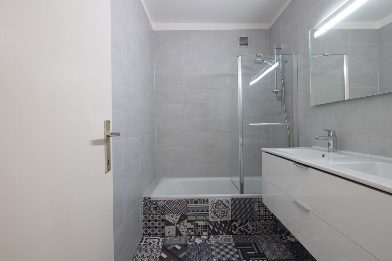 Het appartement beschikt over twee volwaardige slaapkamers, elk met een aangename sfeer en voldoende ruimte voor een dubbel bed en opbergmogelijkheden. De badkamer is functioneel ingericht met een lavabo en bad.